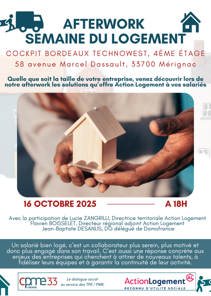 La CPME Gironde vous invite à son Afterwork Semaine du Logement le 16 octobre 2025 à 18h à Mérignac (Cockpit Bordeaux Technowest).